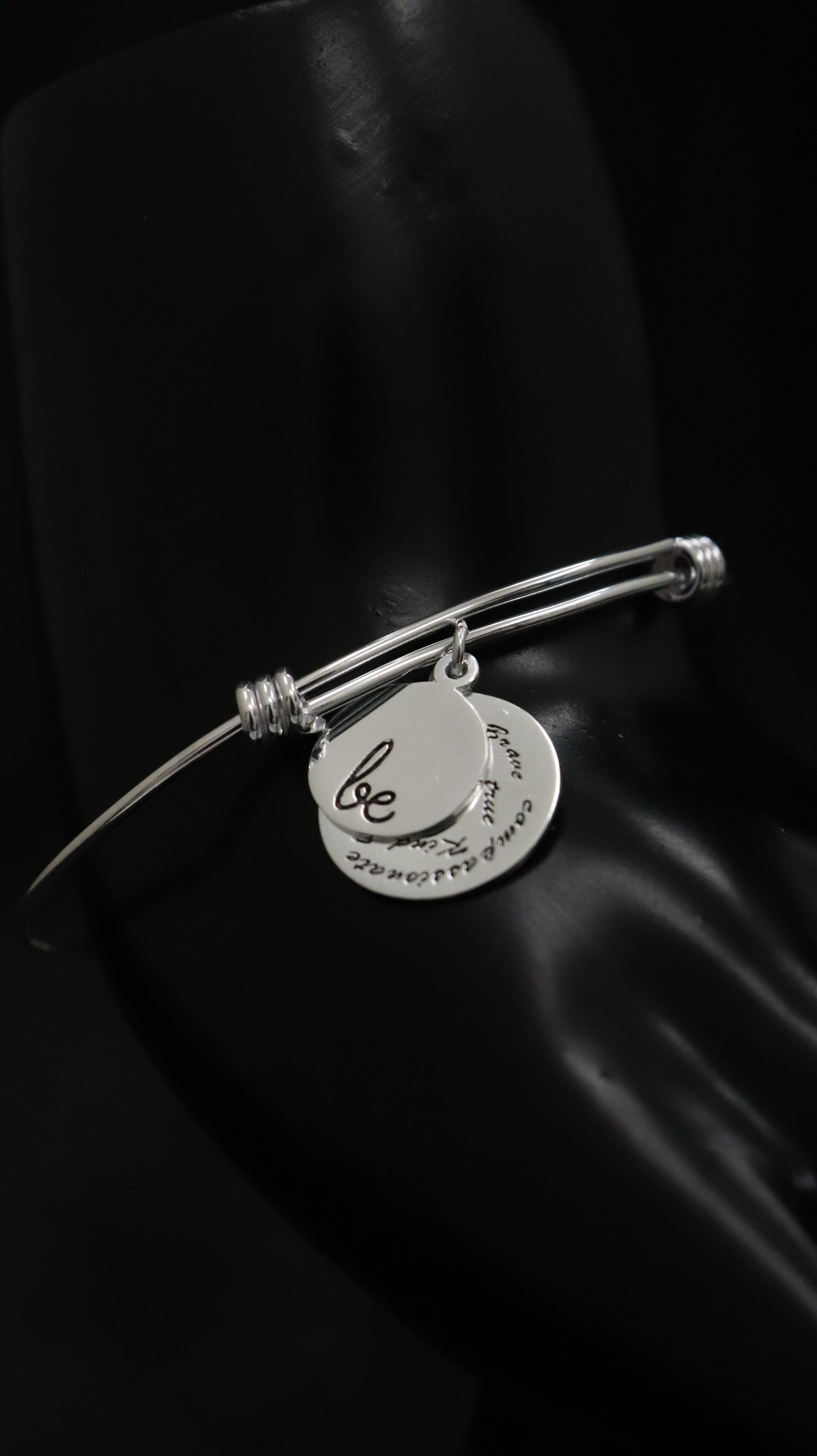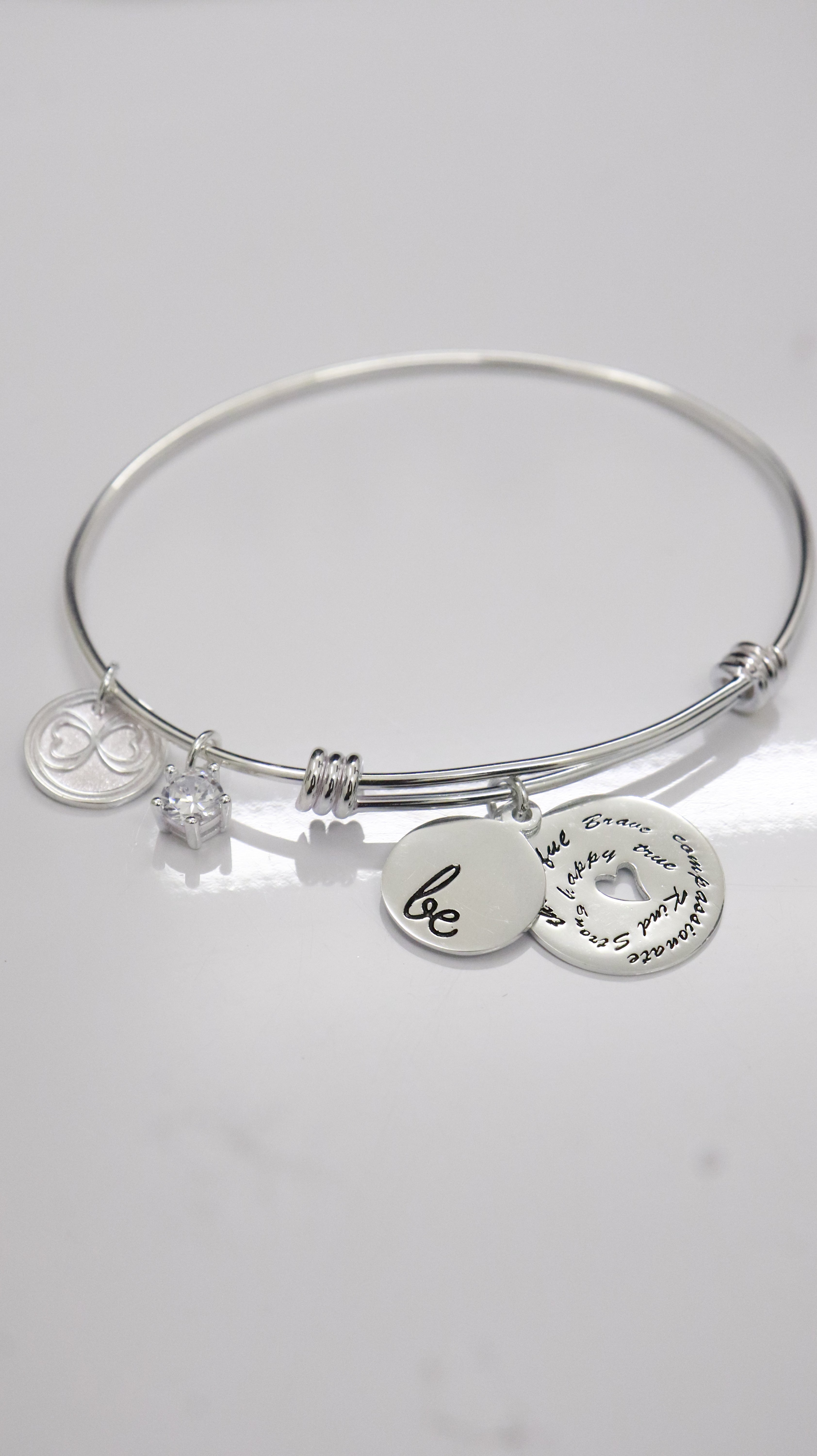 Design: Open silver bangle with love charms