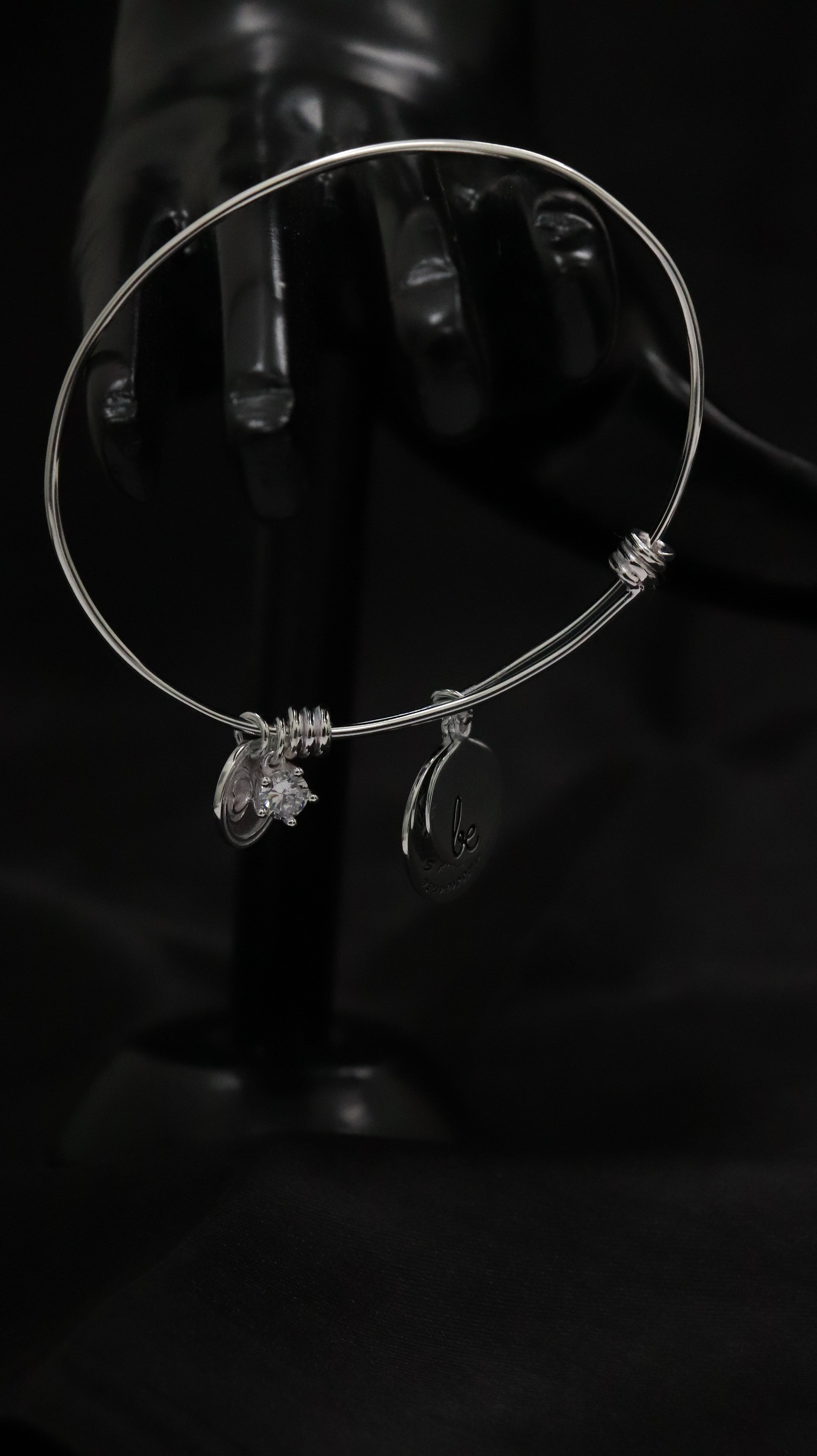 Minimal open bangle with love charm, infinity symbol and single stone, crafted in 925 sterling silver.
