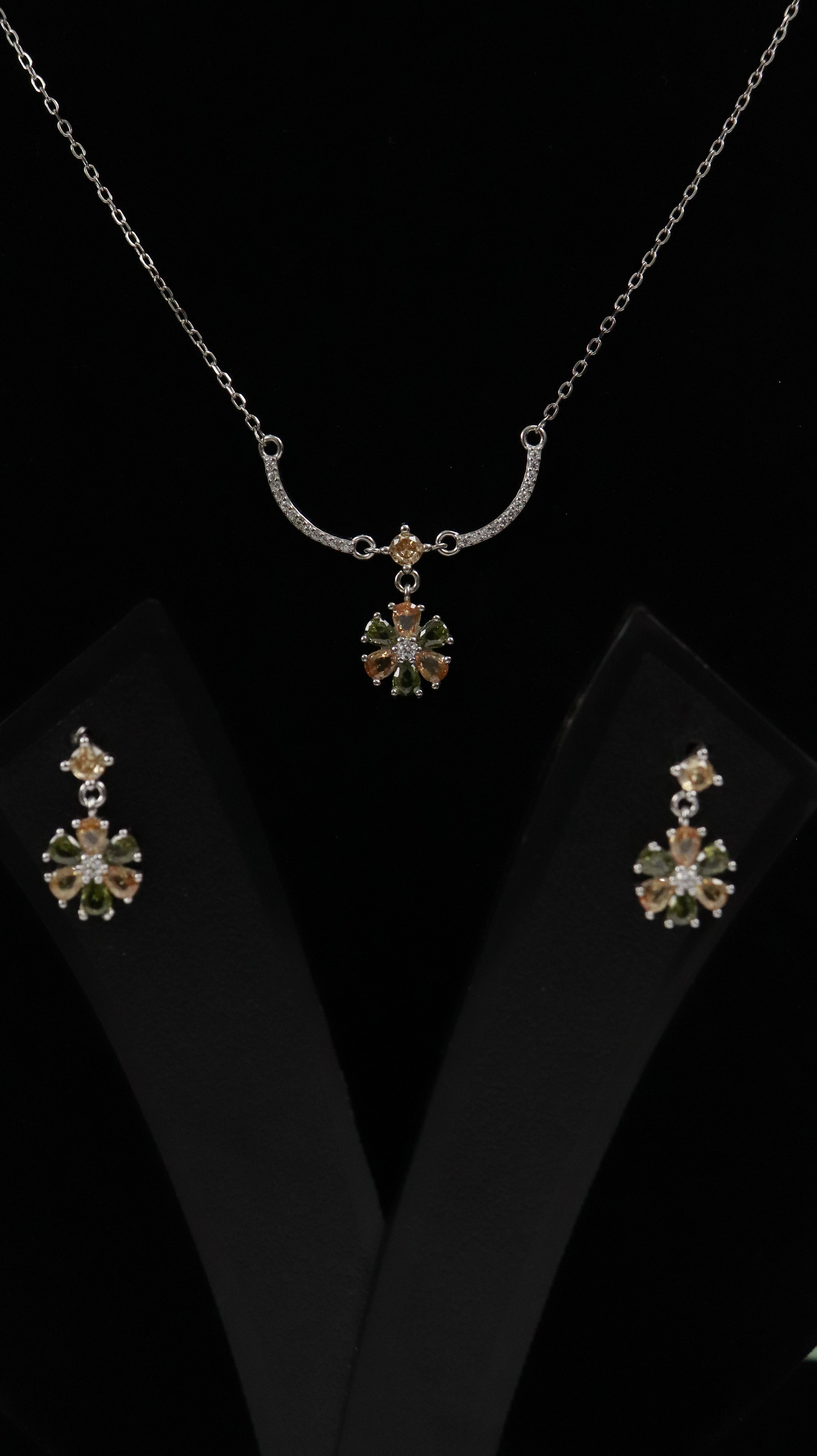 This pendant set comes with a delicate floral design, made with soft green and champagne-toned stones
