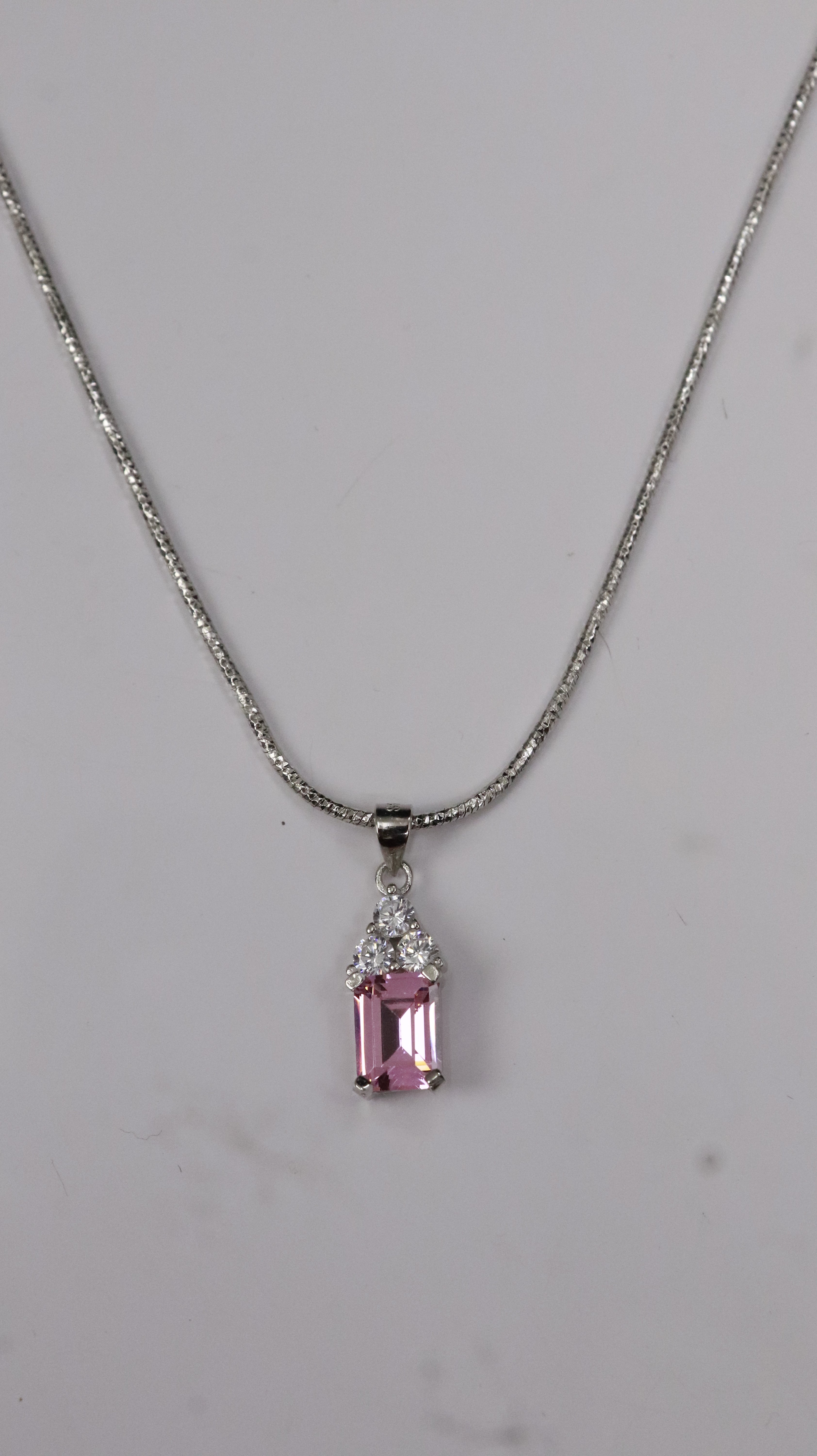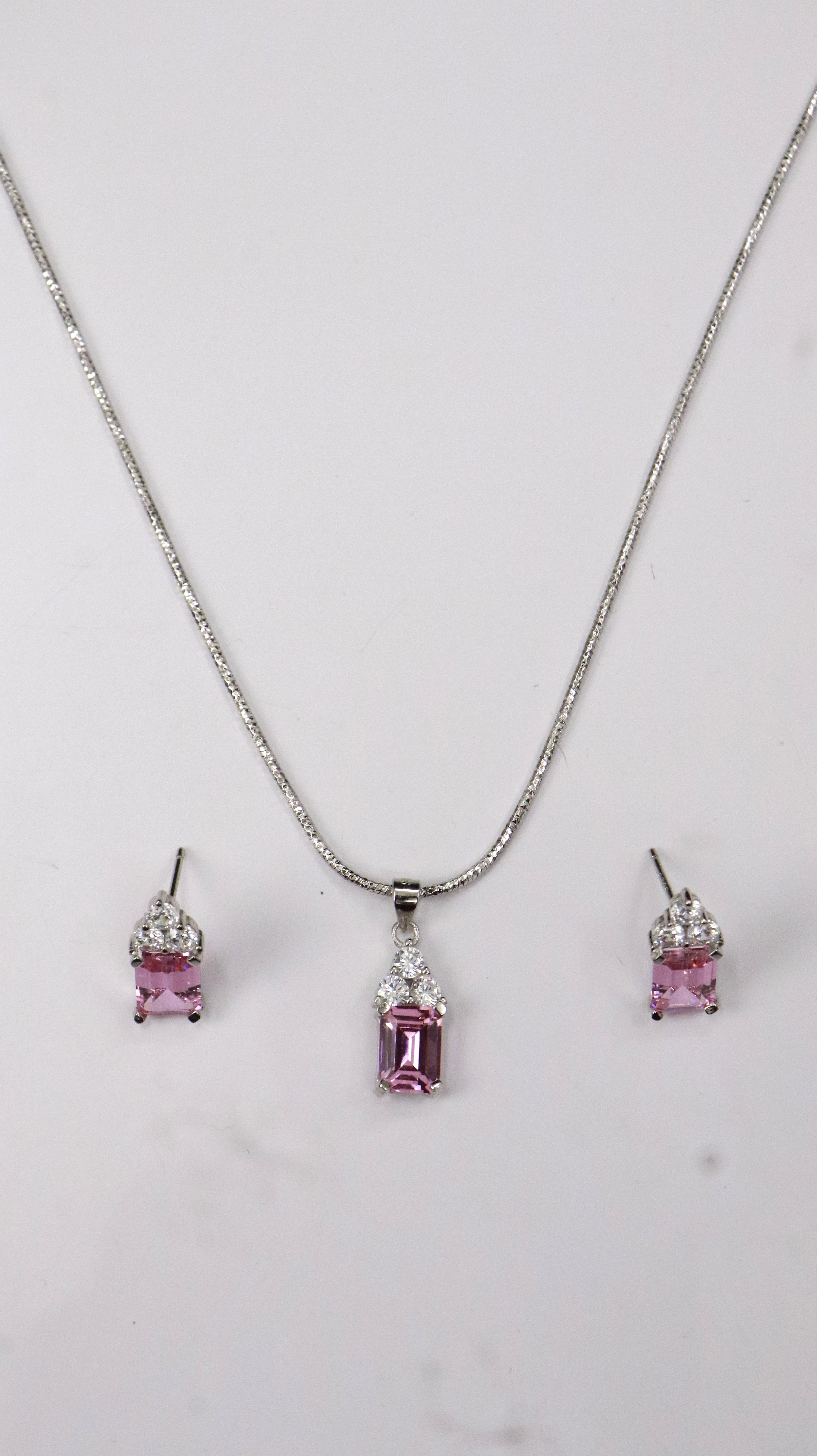This pendant set features a sleek rectangular Pink stone topped with tiny sparkling accents
