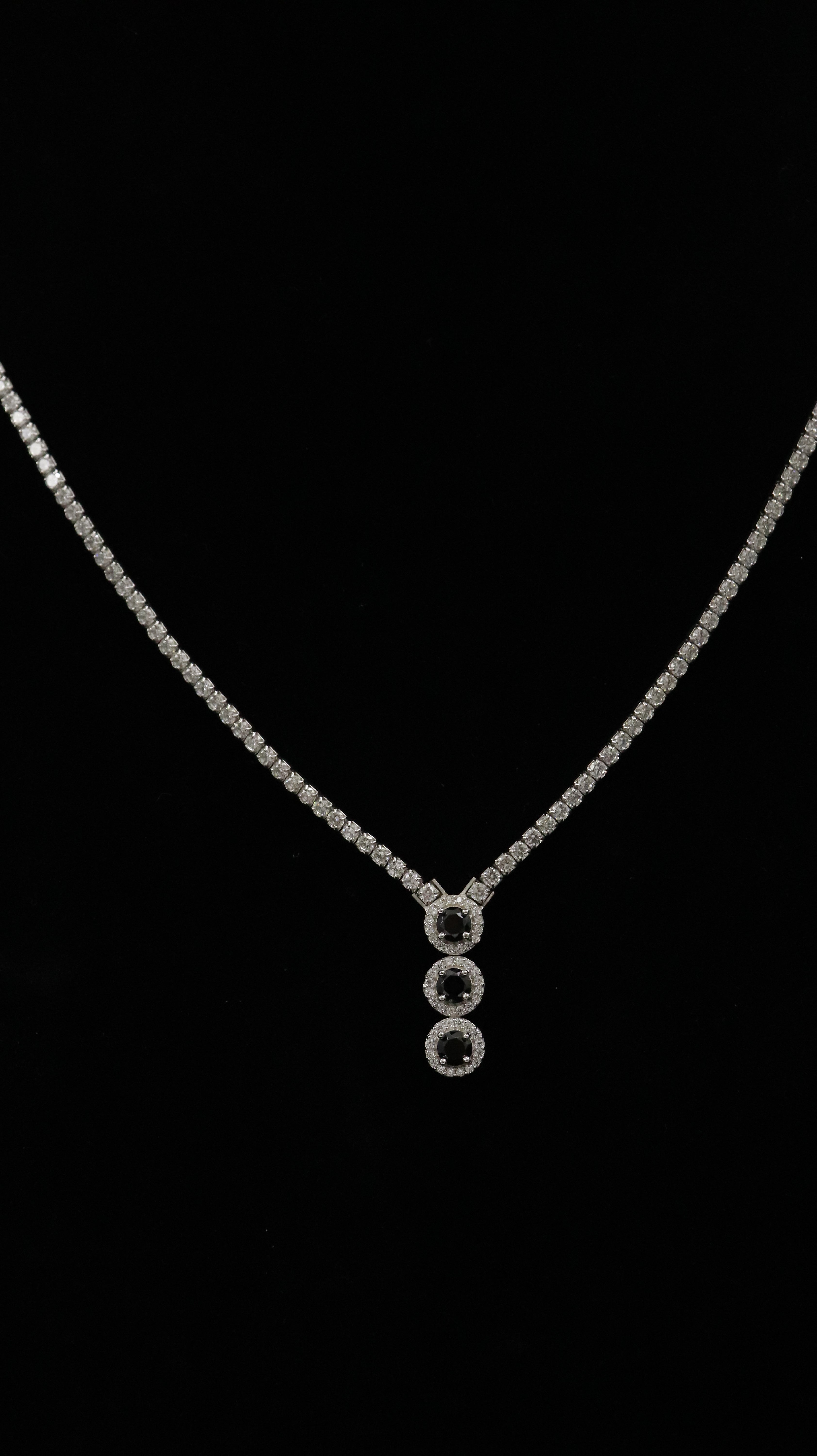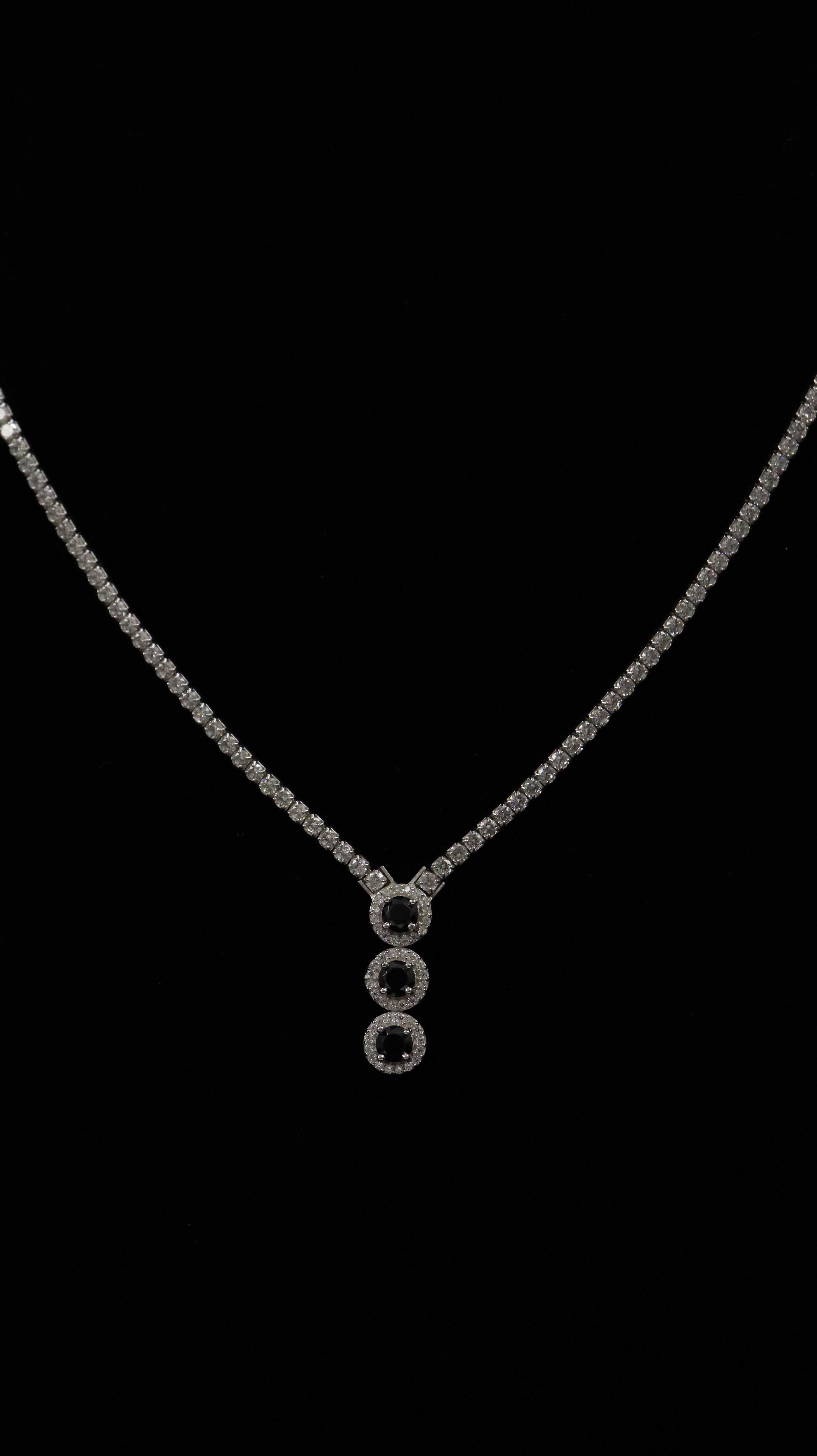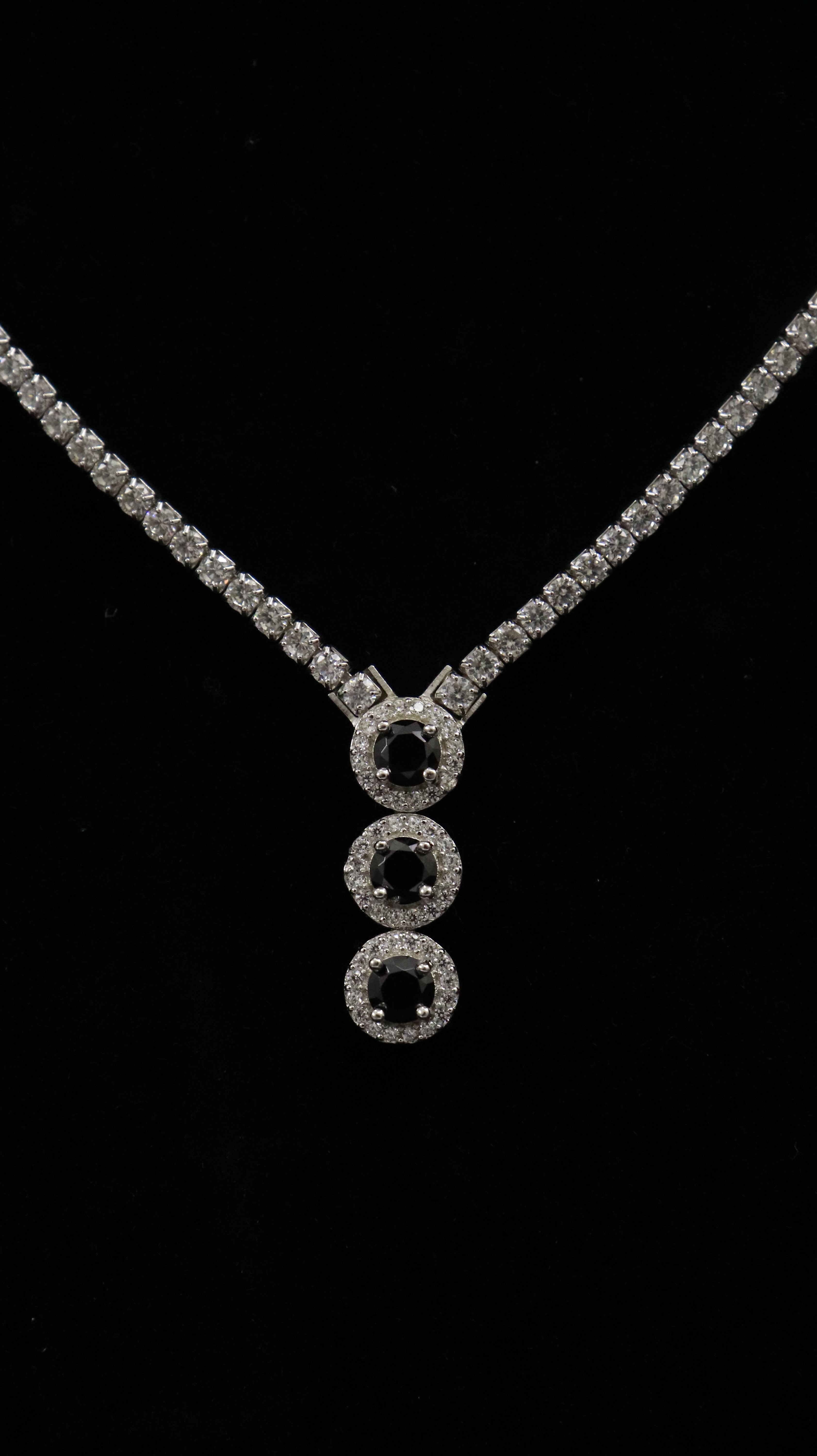 This chain pendant features three round black centre stones placed vertically, each surrounded by tiny white stones