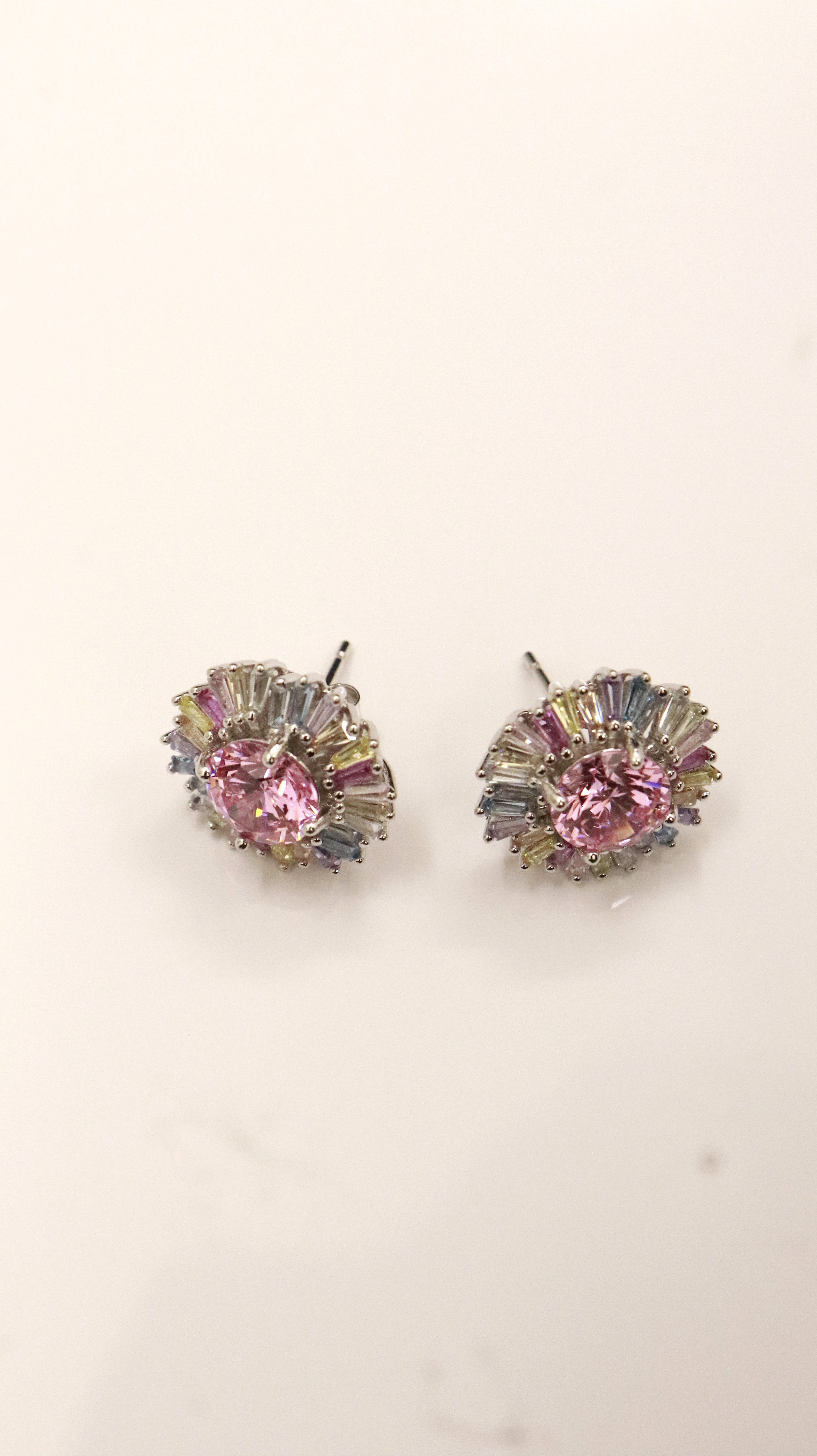 These studs are made in 925 sterling silver with a soft pink round stone in the centre and multicolour crystal petals around it. Looks bright, cute, and classy at the same time.