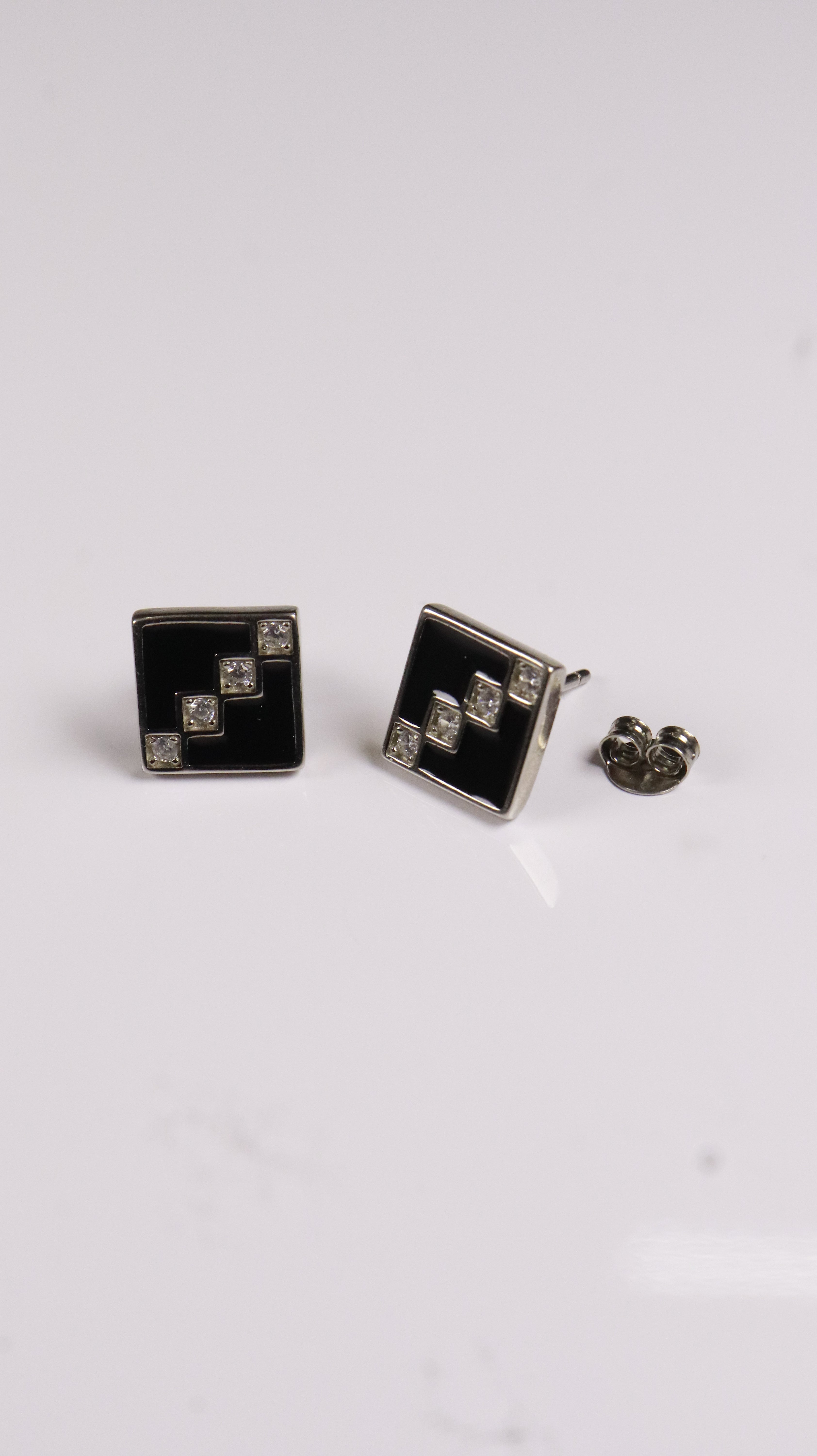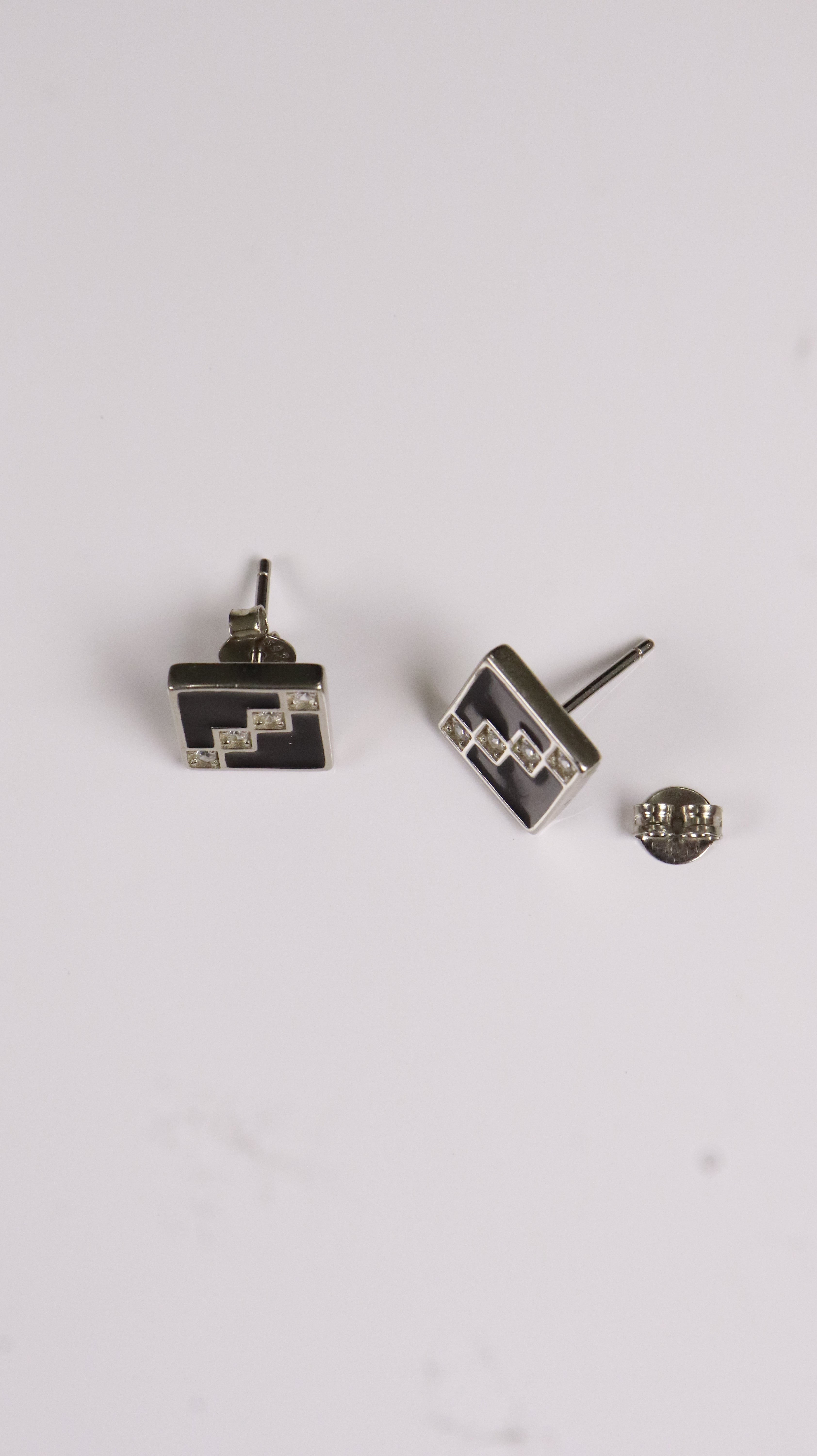 Modern square studs made in 925 sterling silver, with glossy black enamel and small sparkling stones in a stepped pattern. Looks sharp and classy.