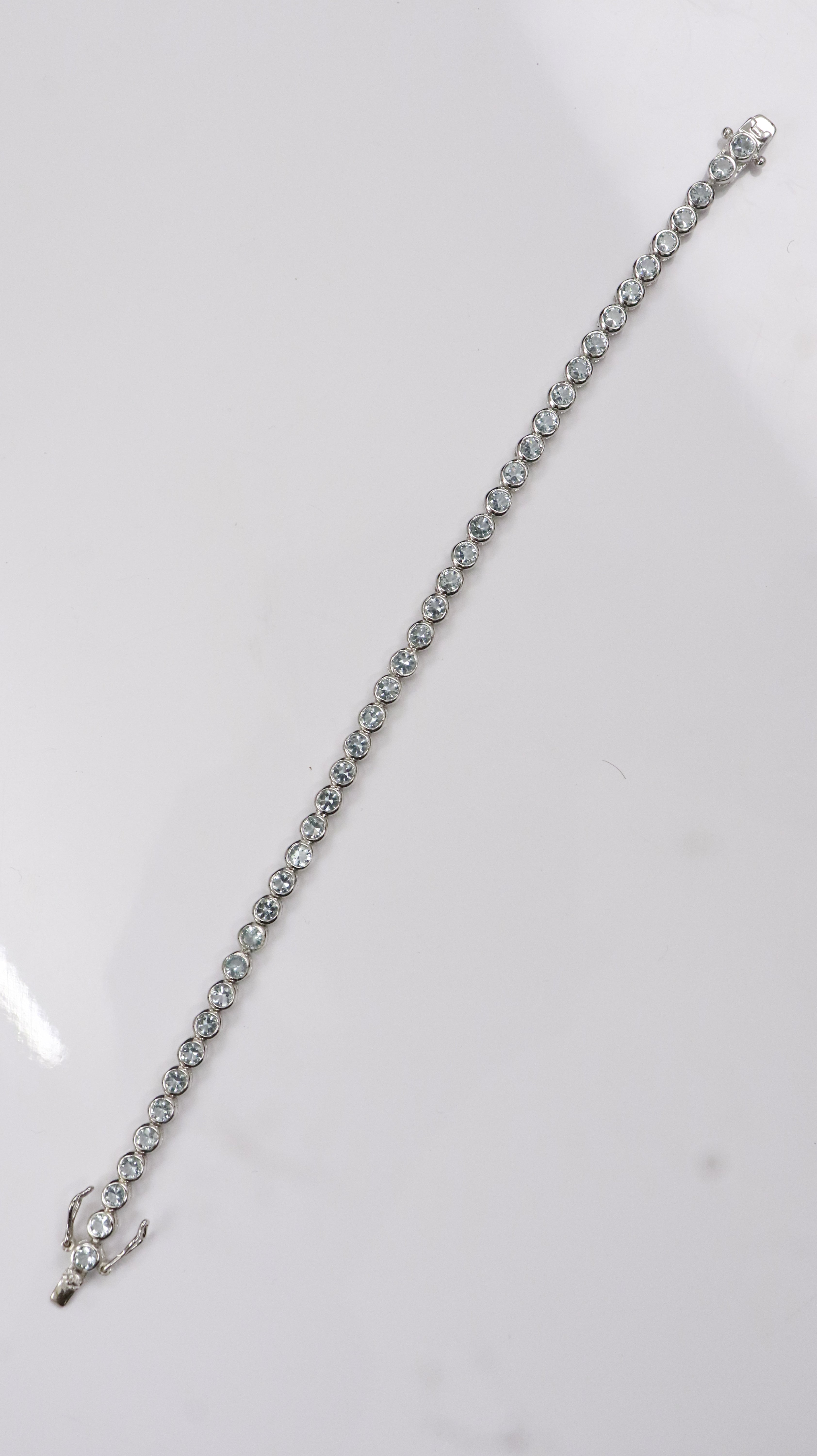 Clean tennis-style bracelet with round stones set in 925 sterling silver. Looks classy and neat on wrist.