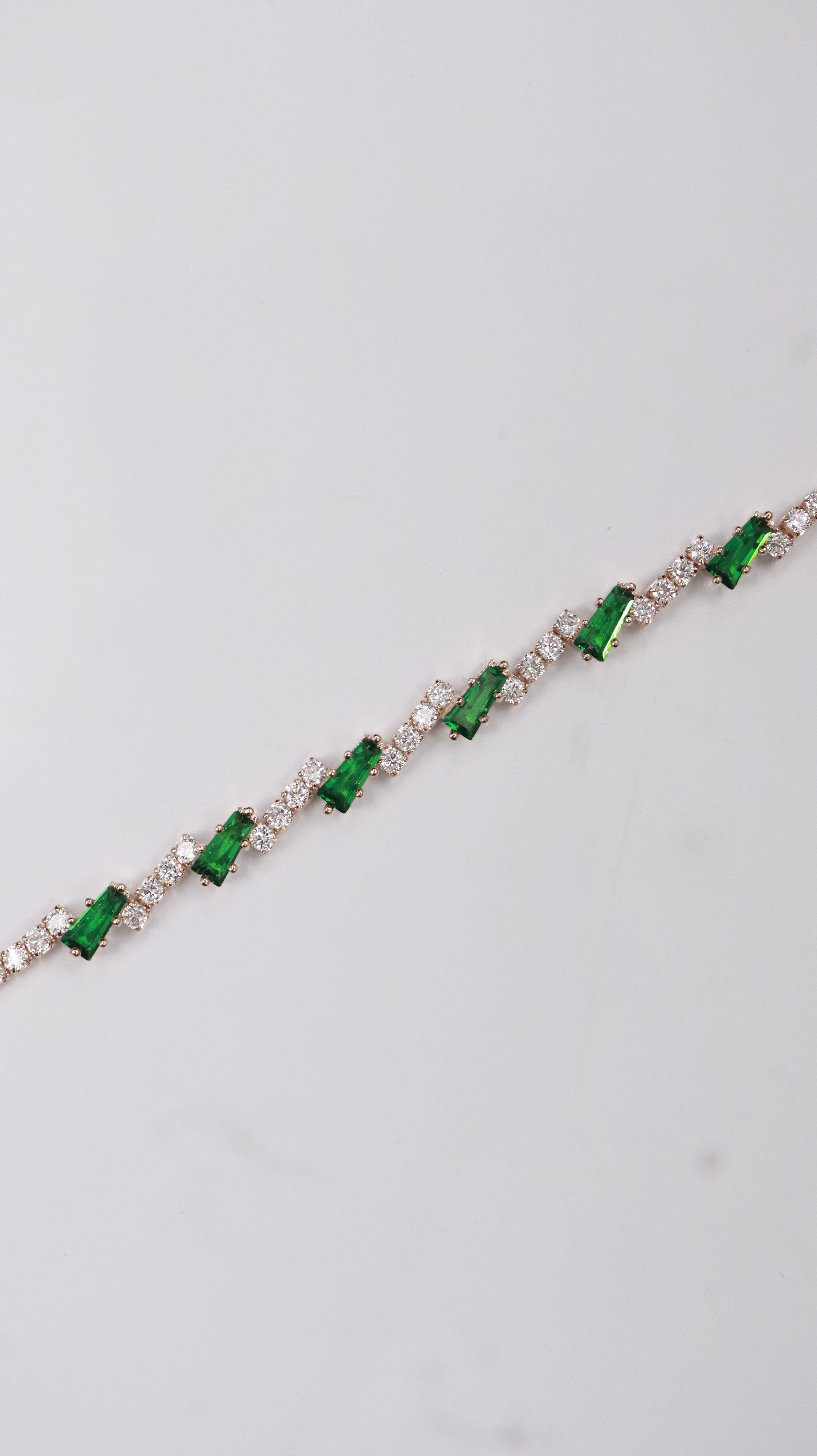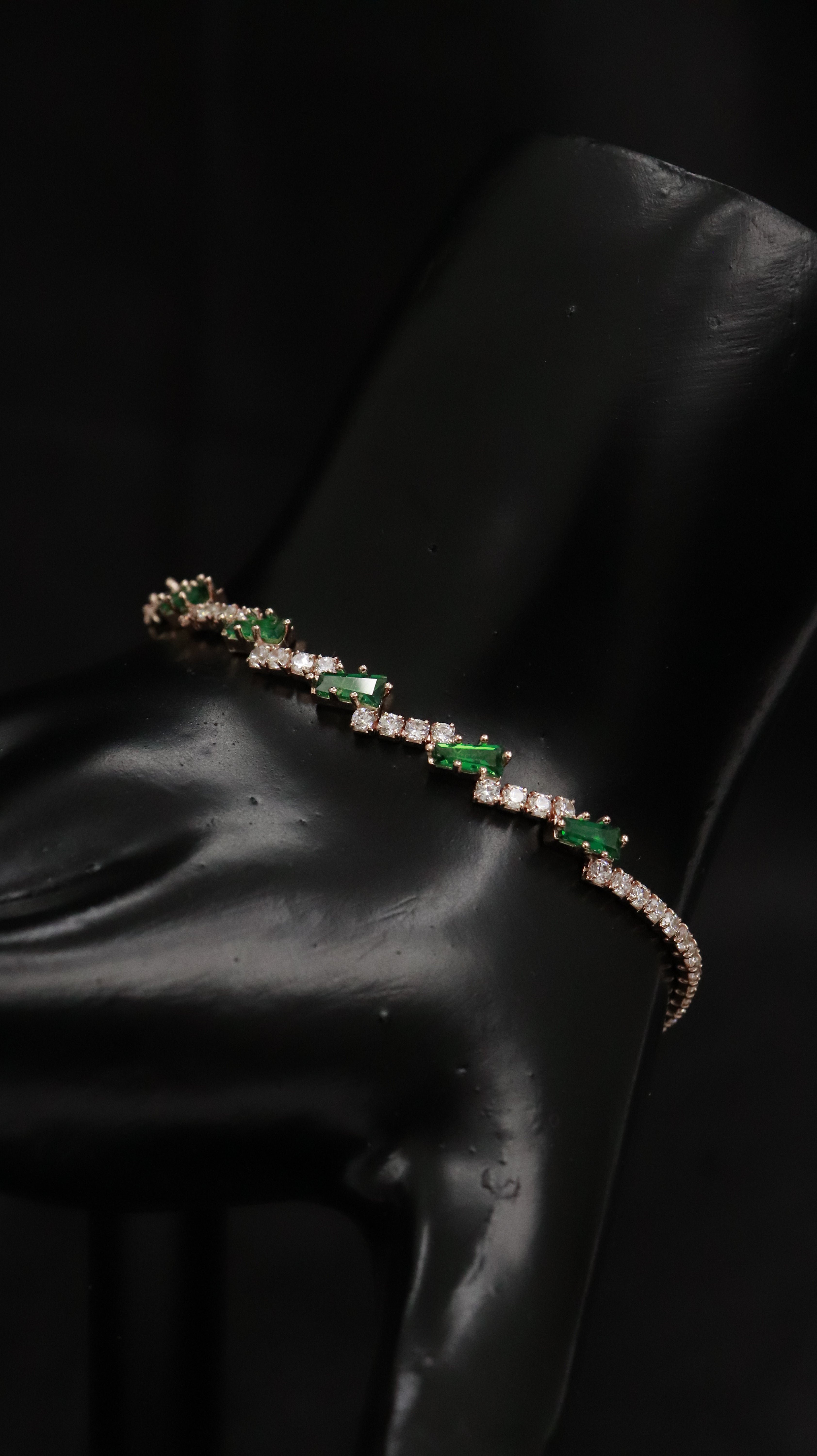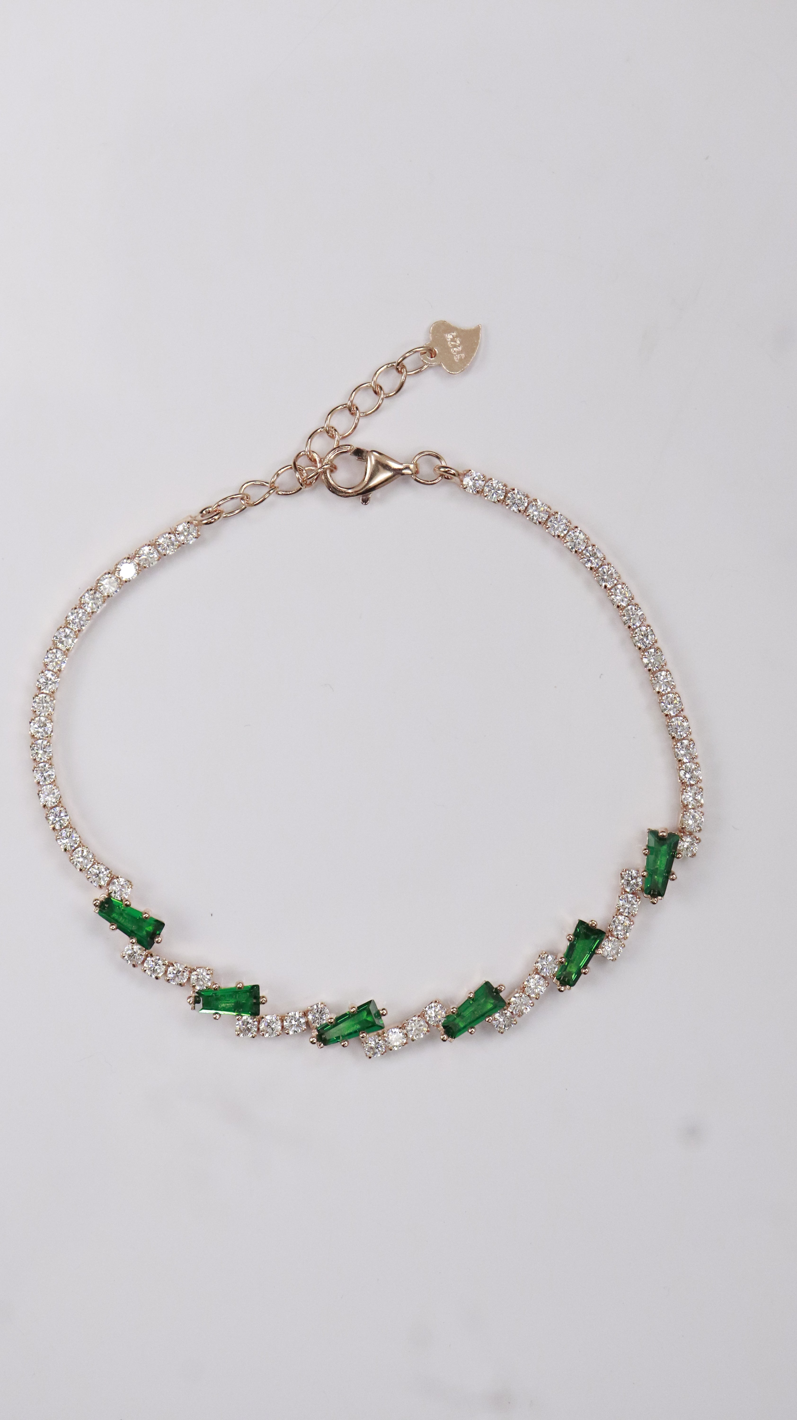 Slim silver bracelet with emerald-green rectangular stones set between tiny white sparkles. Made in 925 sterling silver, looks rich but easy to wear.