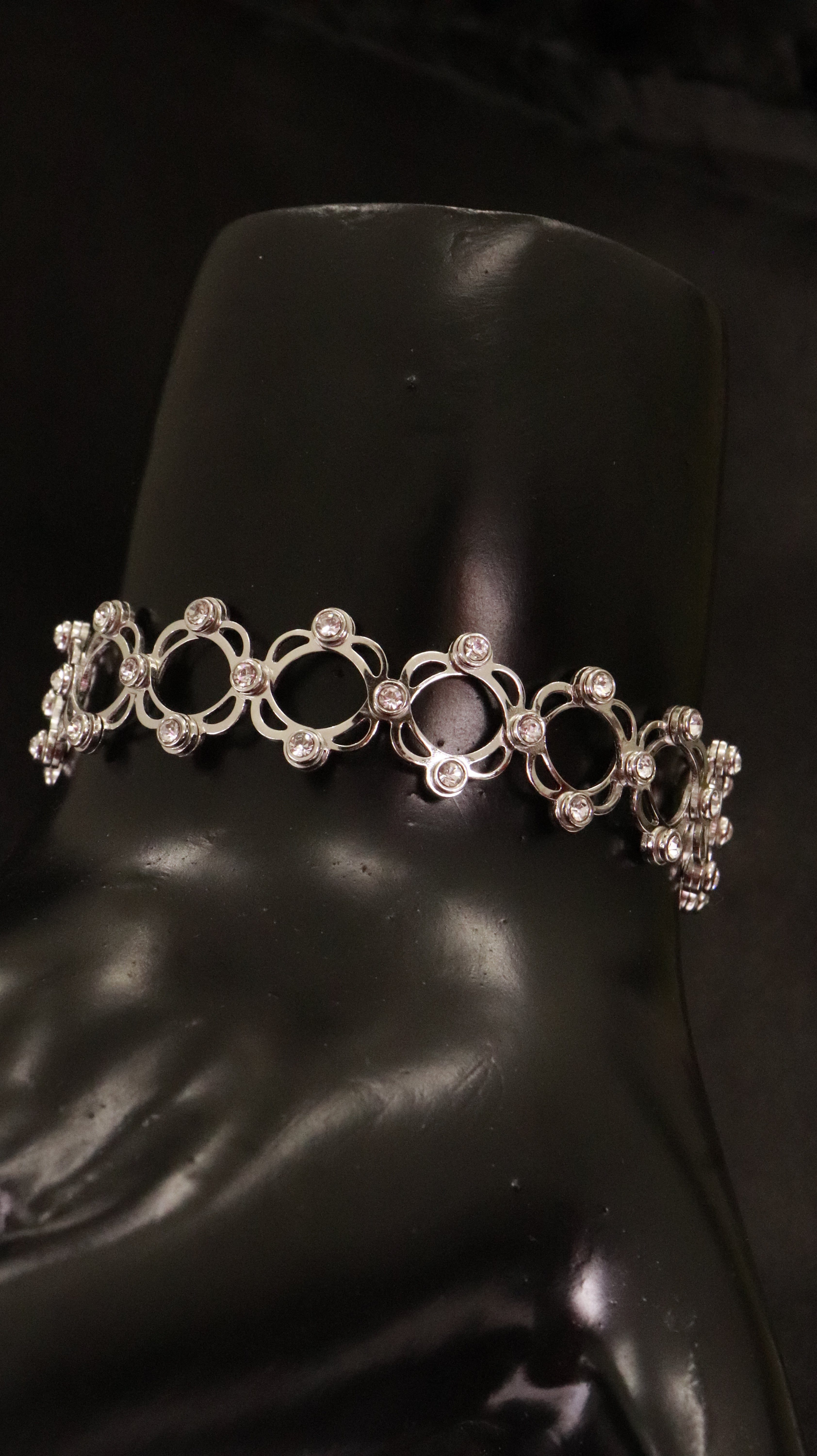 Design: Interlinked silver loops with crystal studs.