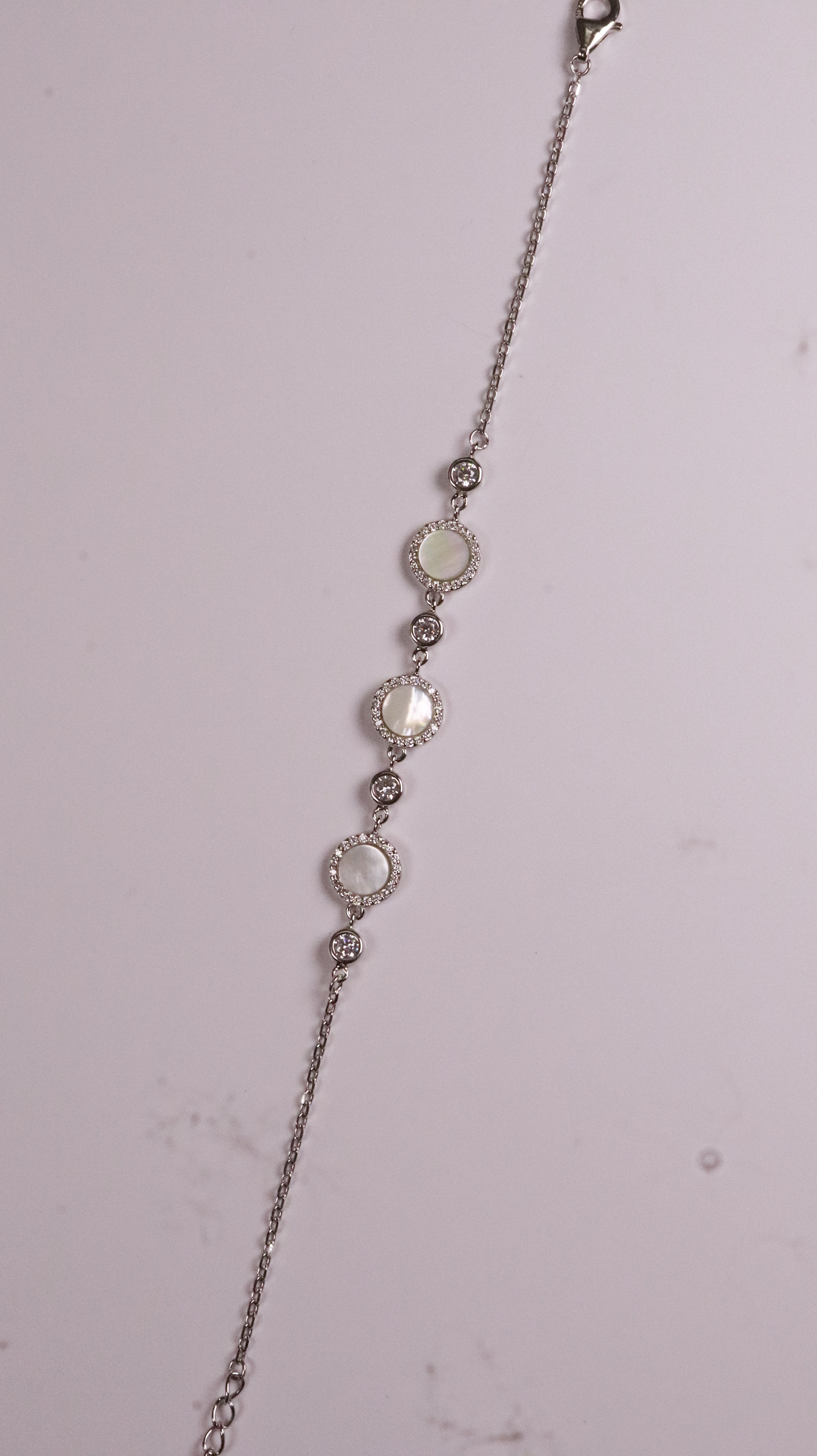 Simple chain bracelet with three white round stone charms, each edged with tiny sparkles. Clean, elegant look in 925 sterling silver.