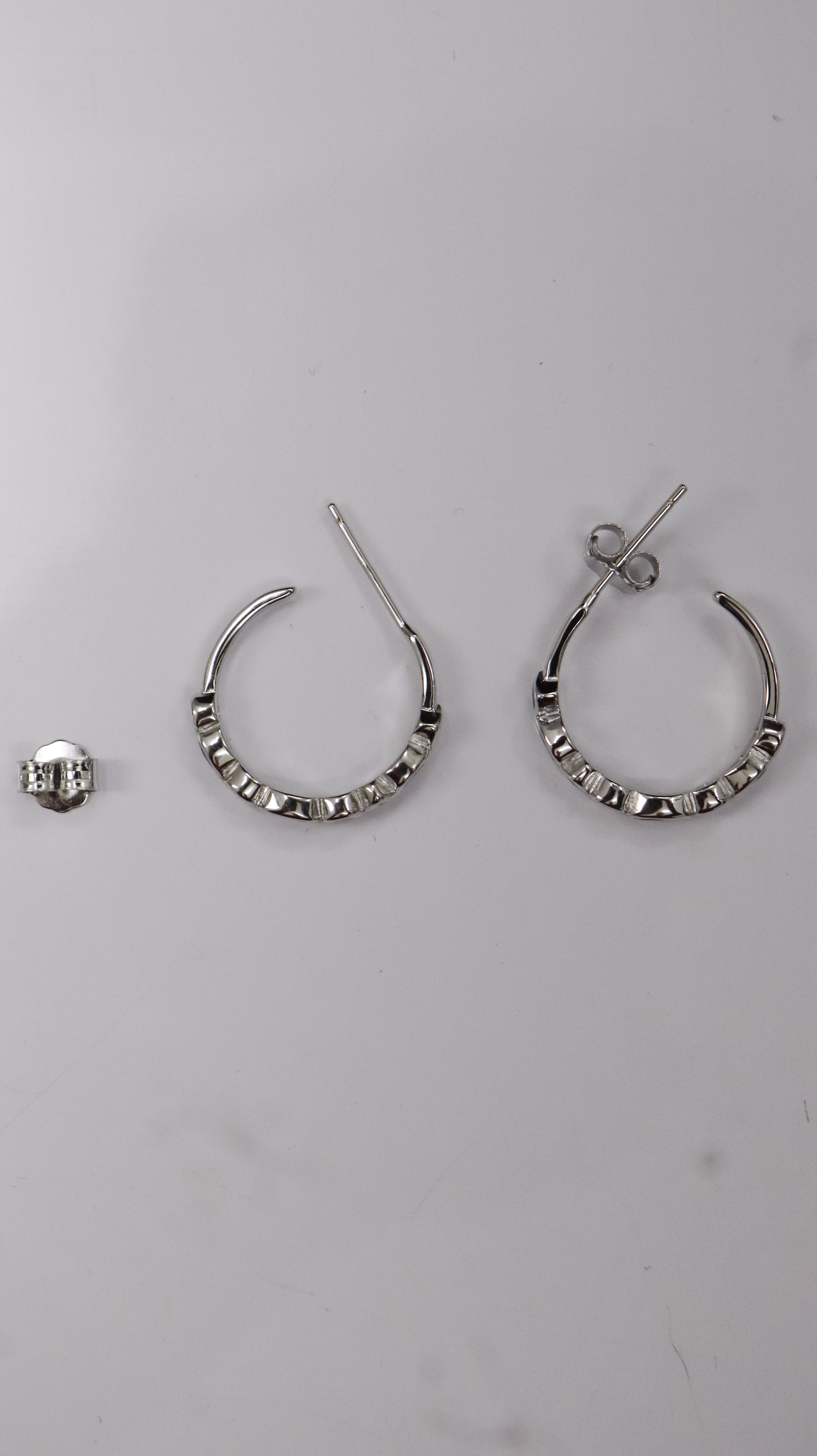 These are small hoop-style earrings with tiny coloured stones set all around. Made in 925 sterling silver, the design looks trendy but still simple.