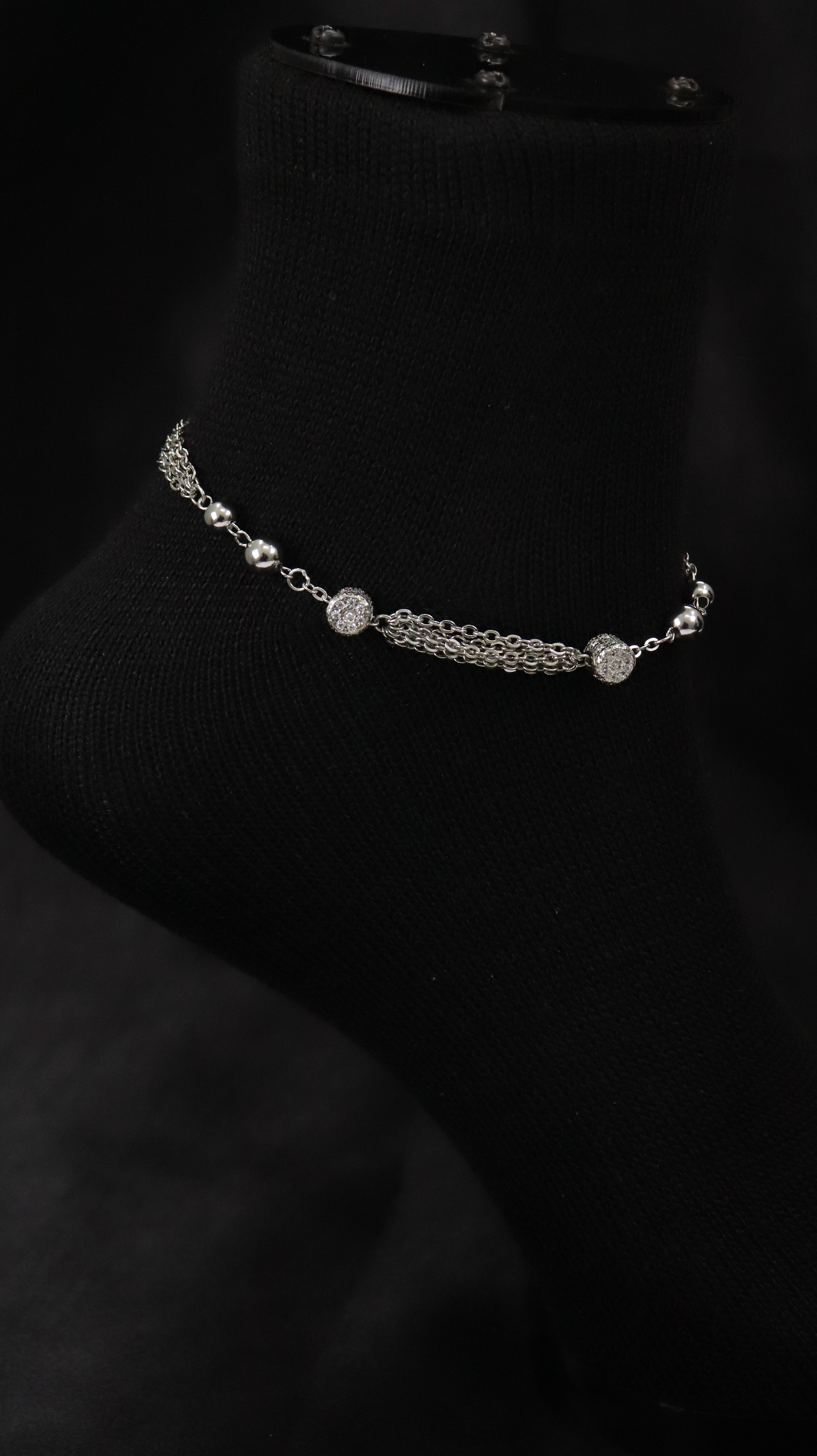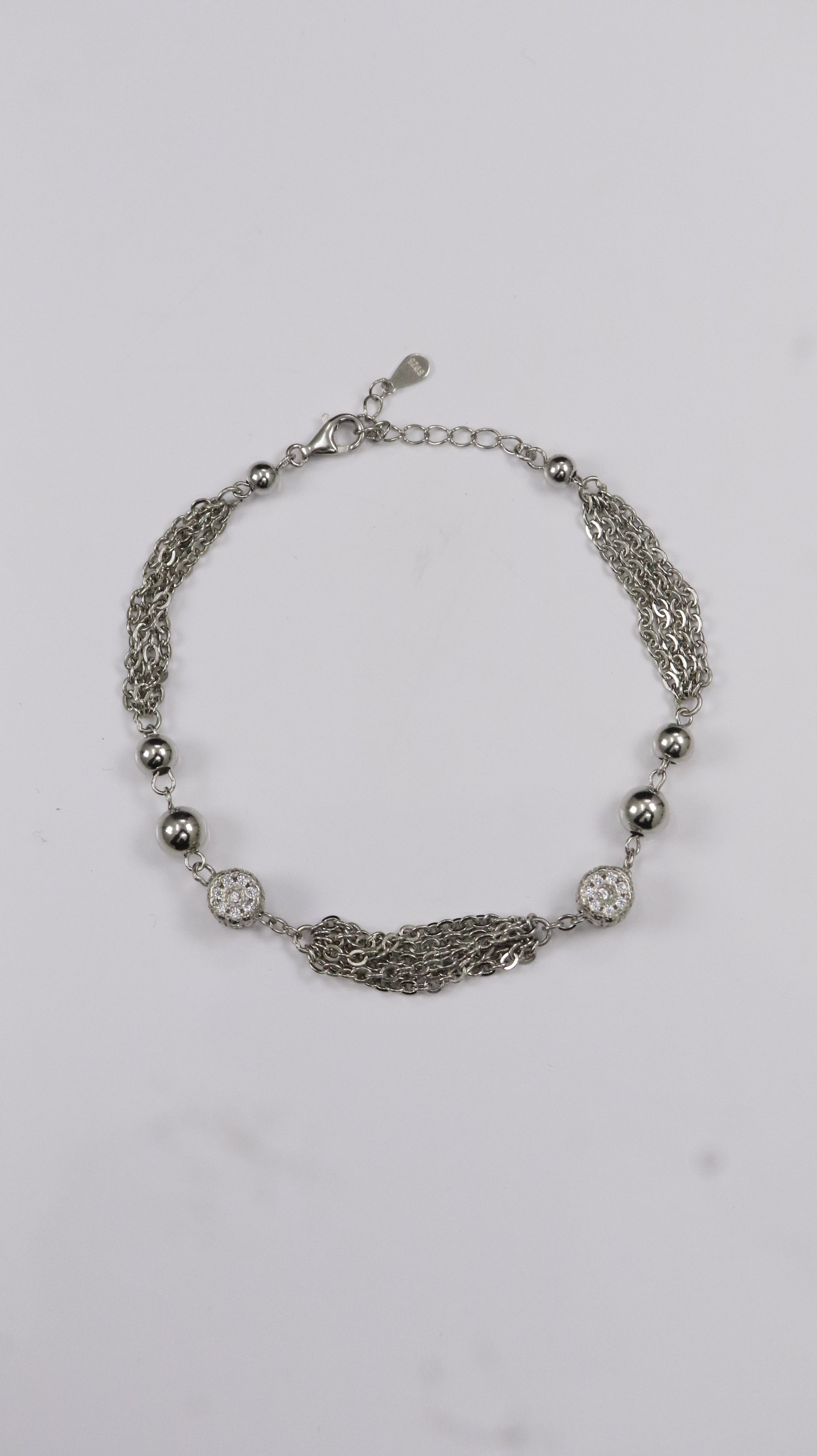 This anklet is made in 925 sterling silver and comes with a layered chain design. It has small round silver balls and textured disc charms placed neatly in between.