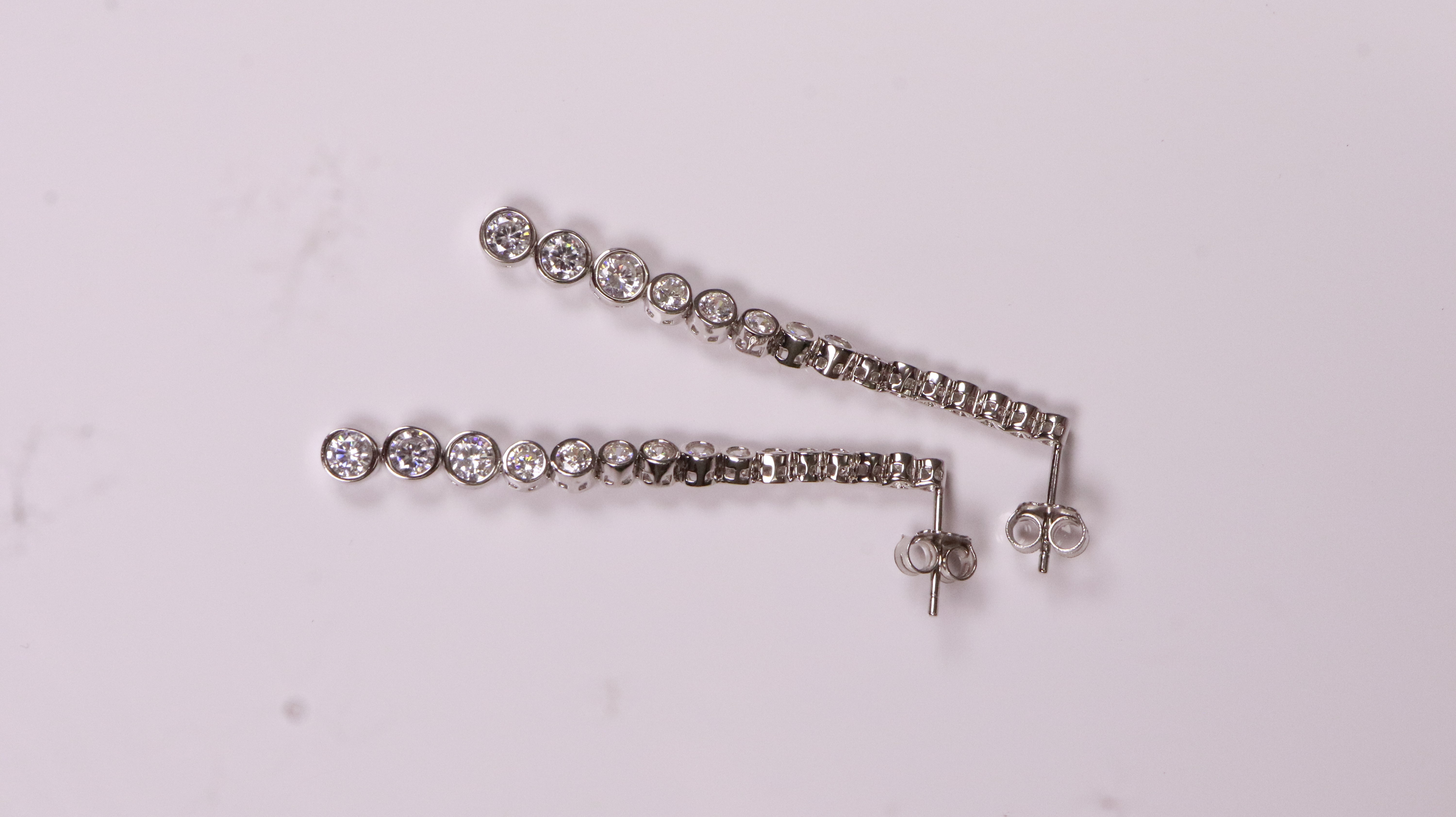 These are long straight drop earrings with round white stones set one below the other. Made in 925 sterling silver.